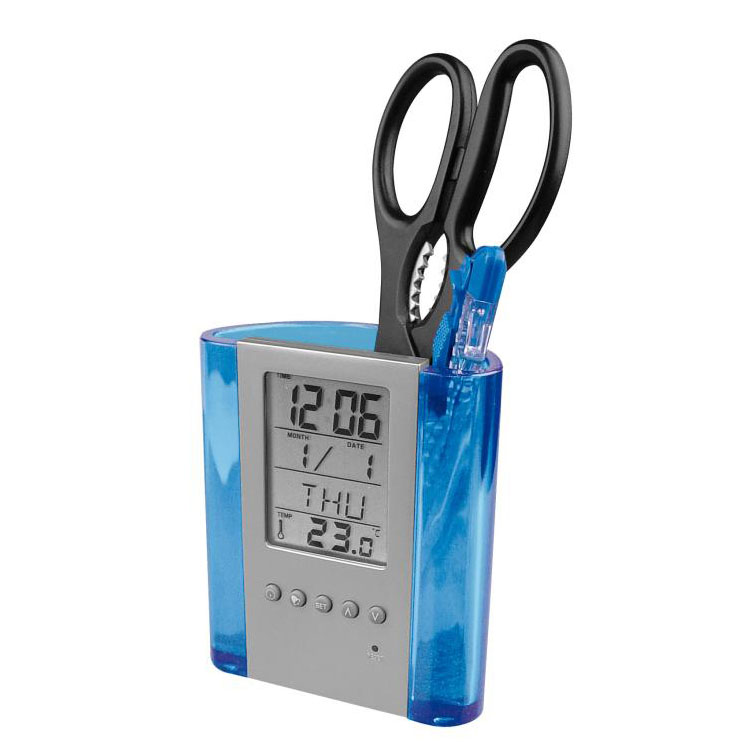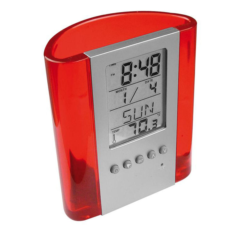 Akrylový držiak na písacie potreby s hodinami, s dátumom a s teplomerom